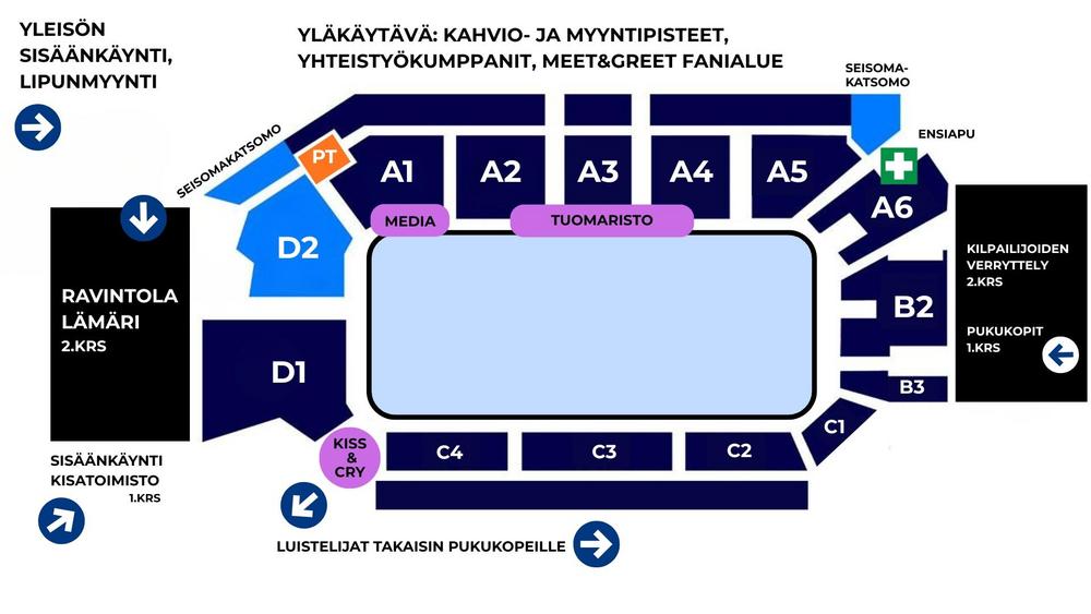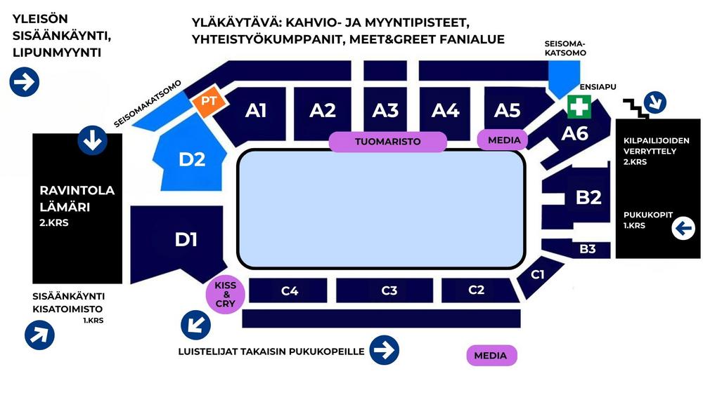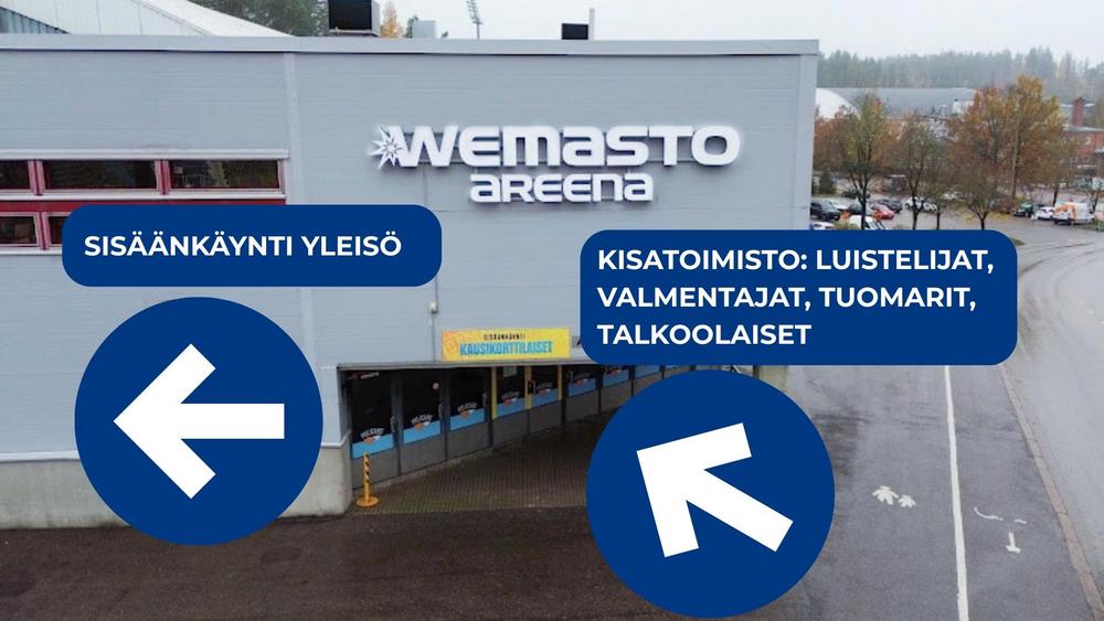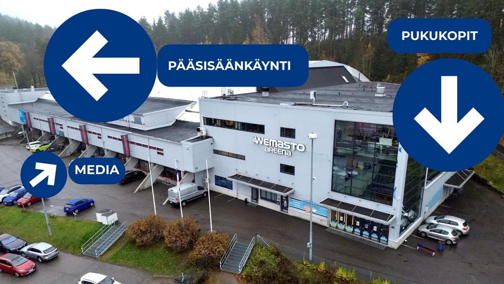 Kilpailijoiden sisäänkäynti pukukoppeihin tapahtuu ulkokautta hallin hyppyrimäkien puoleisesta päädystä.