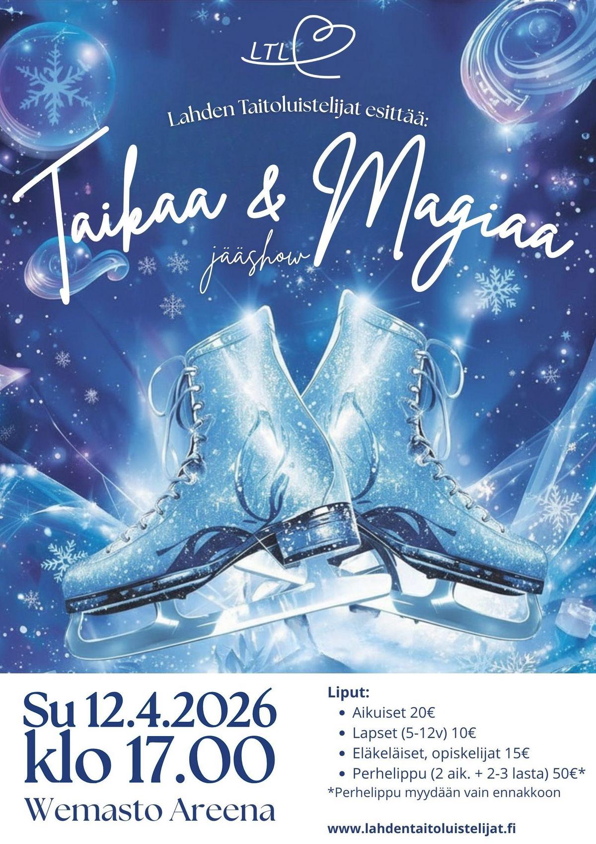 Lahden Taitoluistelijat esittävät upean Taikaa & Magiaa -jääshown, jossa jää herää eloon tarinoiden, musiikin ja säihkyvien ohjelmien kautta. Jäällä nähdään seuran kaikki luistelijat luistelukoululaisista aina aikuisluistelijoihin asti.